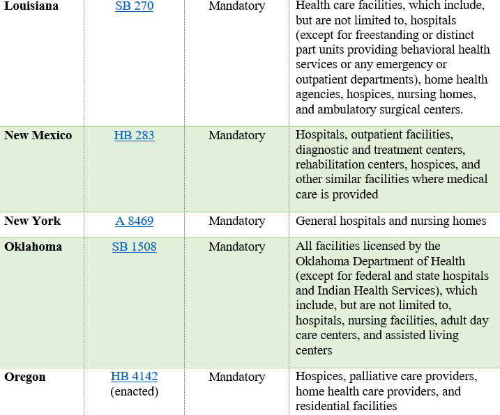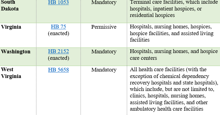 In connection with the establishment of state cannabis programs, a number of states enacted legislation addressing patients’ use of medical cannabis in health care facilities. To date, most of these laws have been permissive in nature, permitting (but not requiring) certain health care facilities to allow qualifying patients to use medical cannabis onsite or protecting employees from prosecution. New York, for example, permits hospitals to authorize patients to bring in their own medications, including medical cannabis.5 Virginia protects employees of SNFs, hospices, and assisted living facilities from prosecution for possessing or distributing cannabis oil to patients with valid certifications.6