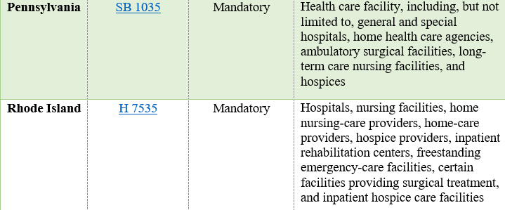 As with Ryan’s Law in California, these proposed and enacted state laws do not include strict enforcement mechanisms. The laws are silent on private rights of action for patients and do not specify penalties for non-compliance. Moreover, most of these bills explicitly provide that compliance with the medical cannabis provisions shall not be a condition for obtaining, retaining, or renewing a license as a health care facility.