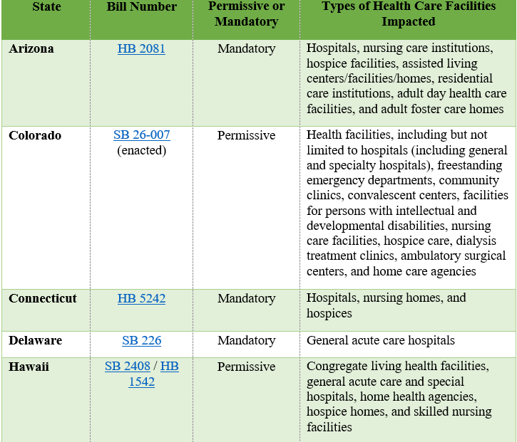 In the 2025-2026 legislative sessions, several states have introduced and enacted legislation addressing the use of medical cannabis in health care facilities. These state bills, which are modeled on a few state laws already in place—most notably, Ryan’s Law in California—seek to address longstanding legal and operational barriers arising from federal law that make it difficult for patients to access state-authorized medical cannabis products in health care facilities like hospitals, SNFs, and hospices.